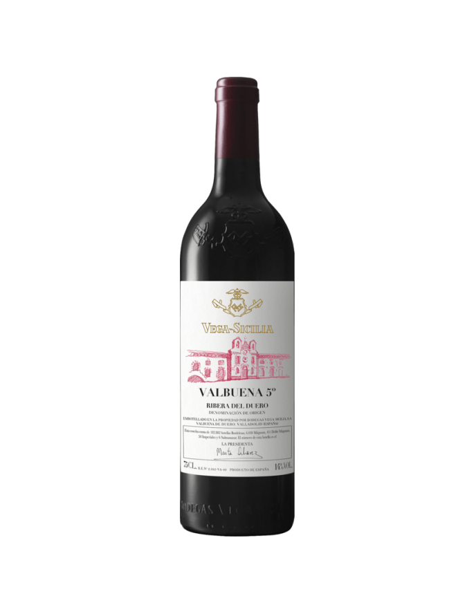 Valbuena 5º es la expresión más pura del tinto en Vega Sicilia, con una crianza de cinco años entre madera y botella, que da su nombre al vino: Valbuena 5º.
