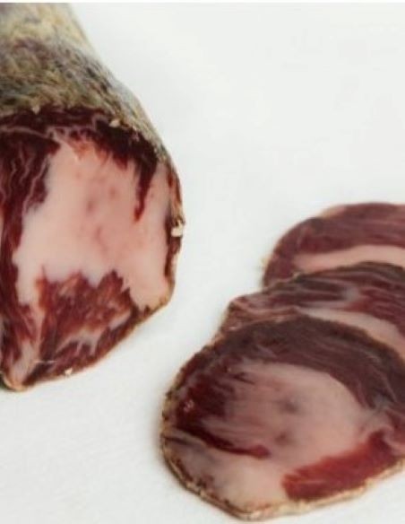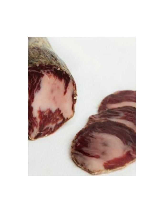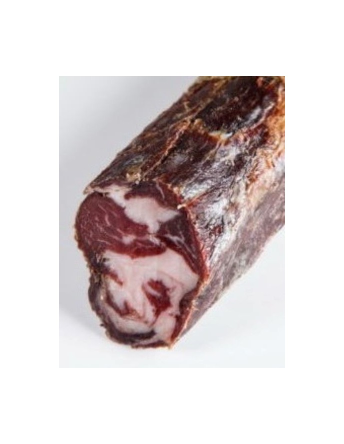 Elaborado a partir del cabecero de lomo con parte de la presa y pluma. Únicamente con ingredientes naturales y más de 6 meses de curación natural.