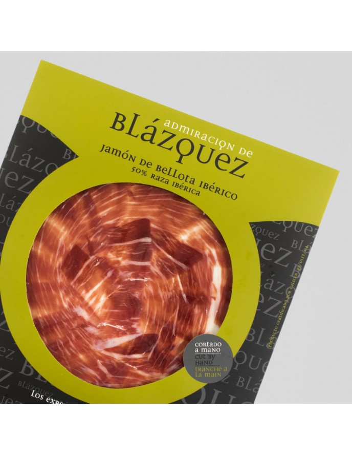 Sobre de 100 gr. de Jamón de Bellota Ibérico Admiración de Blázquez cortado a mano. Una versión fácil y cómoda de servir en plato del más tradicional jamón de esta familia.