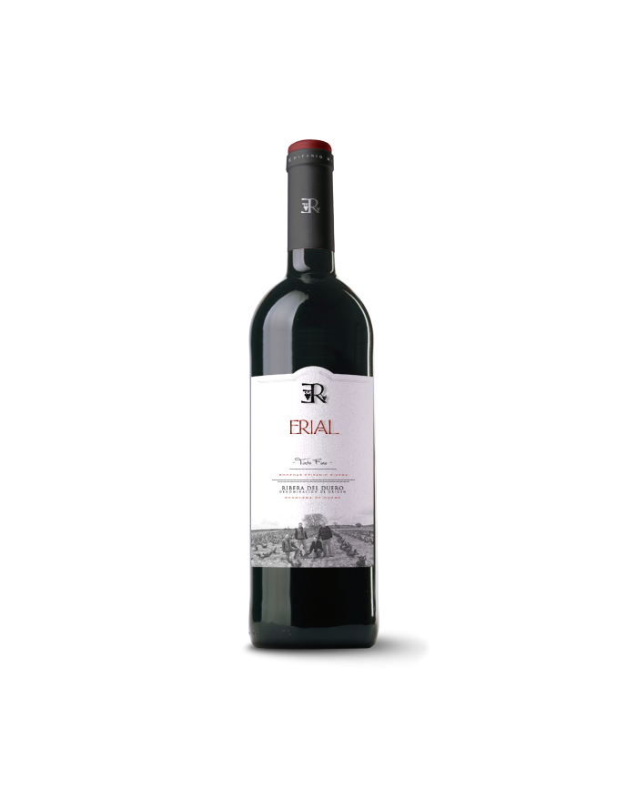 Erial es 100% tinta fina con una estancia en barrica 80% roble francés y 20% roble americano de 12 meses. Rebosante de color, muy vivo.Nariz franca con buena fruta negra madura, regaliz negro y recuerdos minerales con tonos cremosos y ahumados del roble y un final especiado. En boca es estructurado, con un tanino amable y bien fundido, carnoso y con fruta concentrada, muy sabroso, equilibrado y con sensación refrescante debida a una buena acidez.