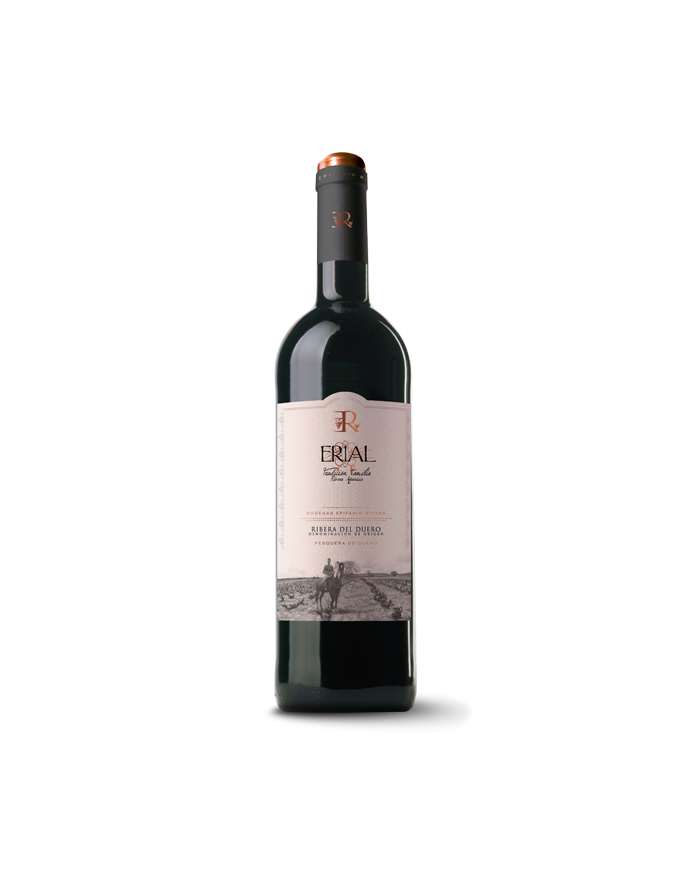 Erial Tradicion Familia Rivera-Aparicio (ERIAL TF) tiene una crianza de 18 meses en barrica de roble francés (85%) y americano (15%) y está diseñado a partir de una selección de uvas distinta de la de Erial. Elaborado con 100% Tinta Fina de viñas viejas de más de 80 años. De alta intensidad colorante, picota oscuro casi opaco. Perfil aromático muy concentrado, fruta madura en sazón, ciruelas, higos y un excelente perfume balsámico, eucalipto y tinta china. Muy bien fundido con la madera, notas especiadas de pimienta y clavo complementan el conjunto. El paso de boca es jugoso, muy frutal, amplio en todo su recorrido, con regaliz que perfuma el paladar, equilibrado y largo. Define muy bien la esencia del terruño.
